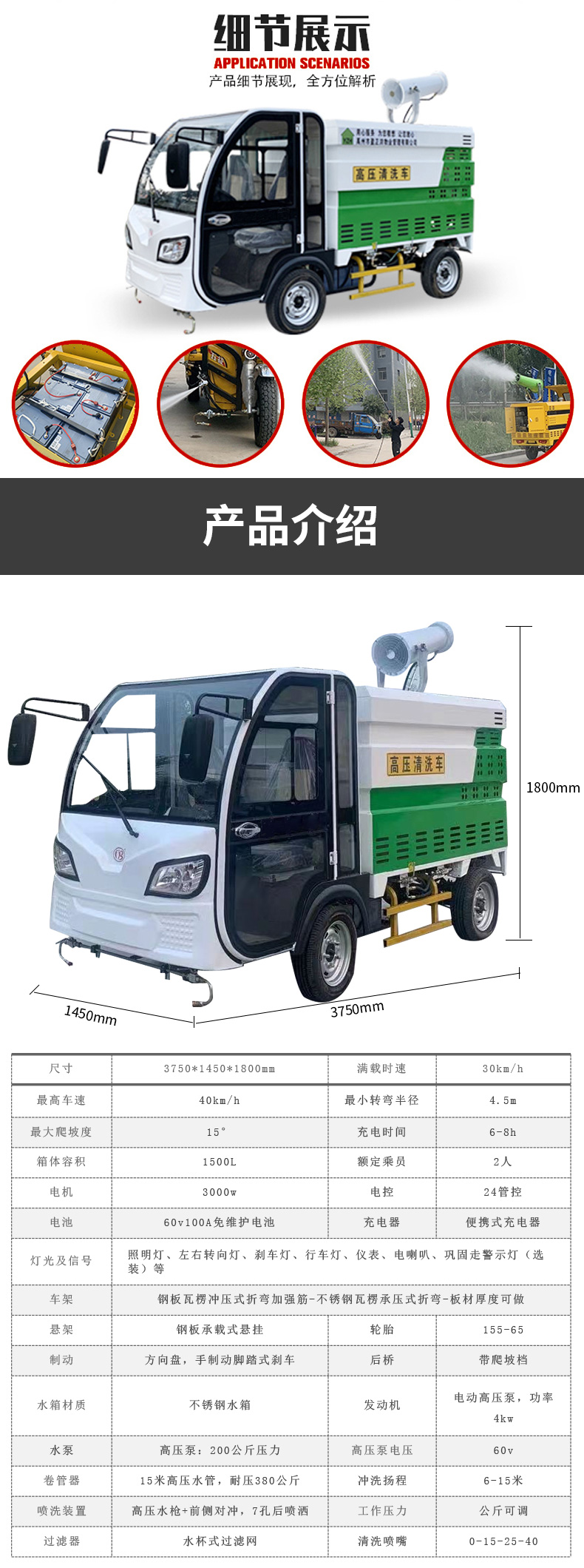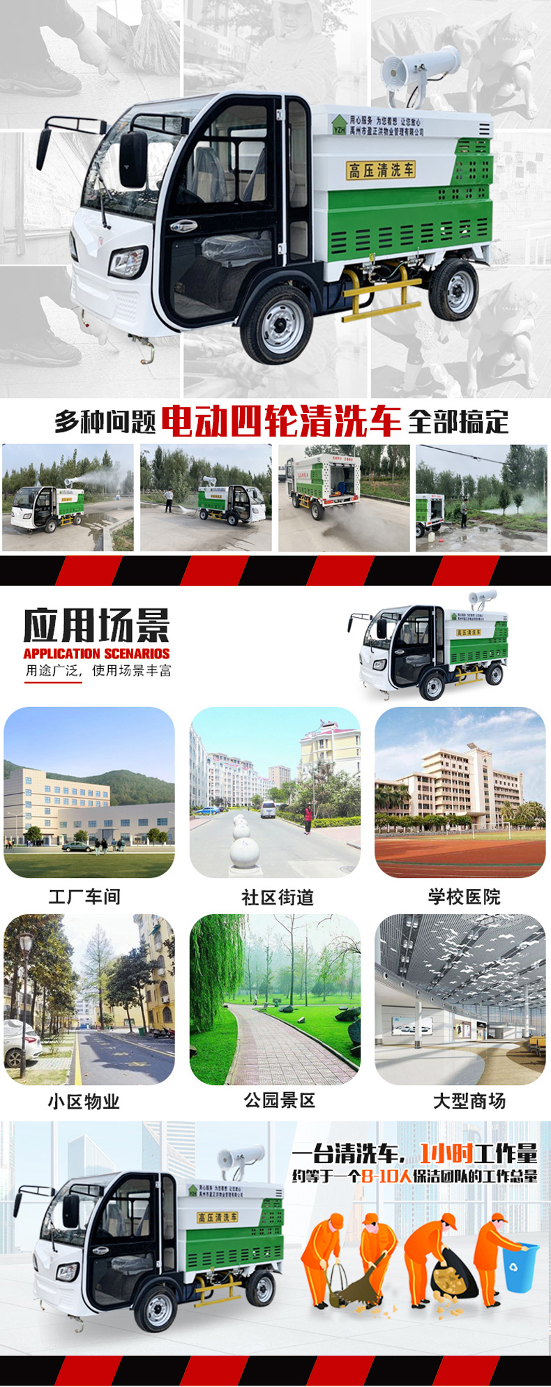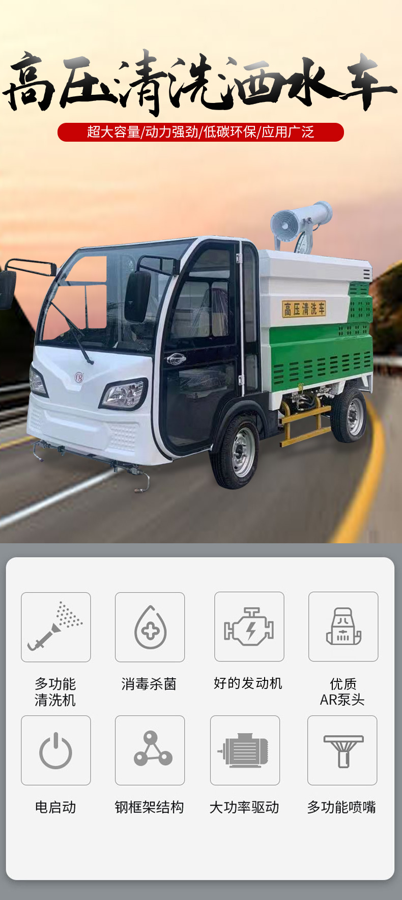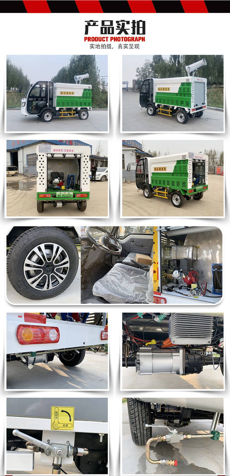 車。產品采用優質電動四輪車底盤,裝配專業的高壓清洗機和水泵,使用方便快捷。內置不銹鋼水箱,永久防銹,是城市街道、物業小區保潔性價比最高的沖洗車產品!