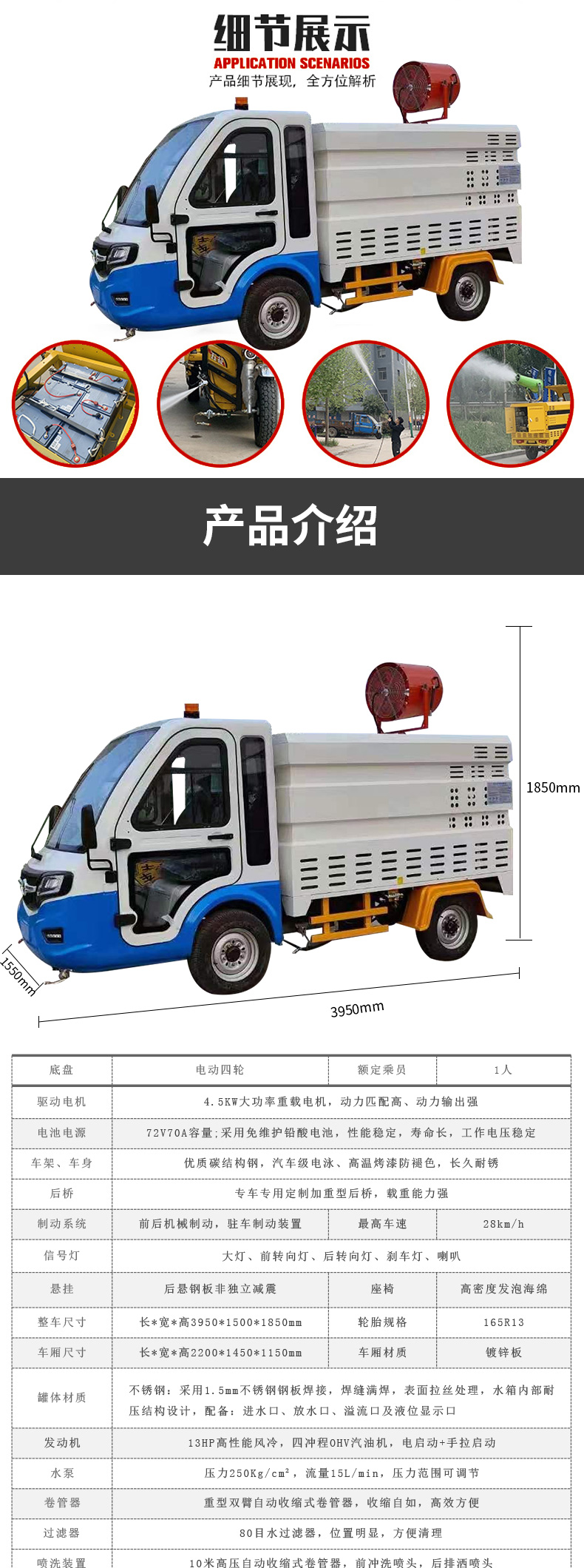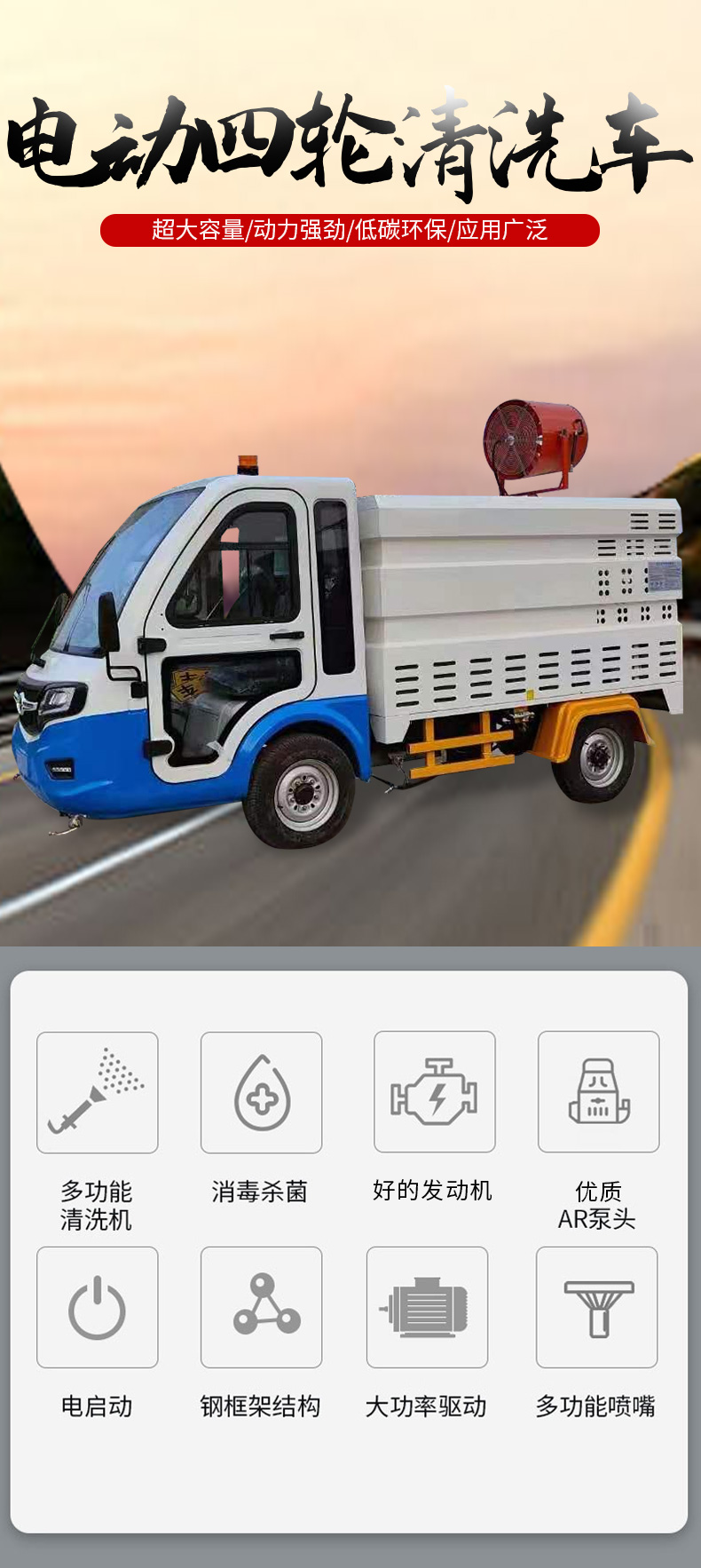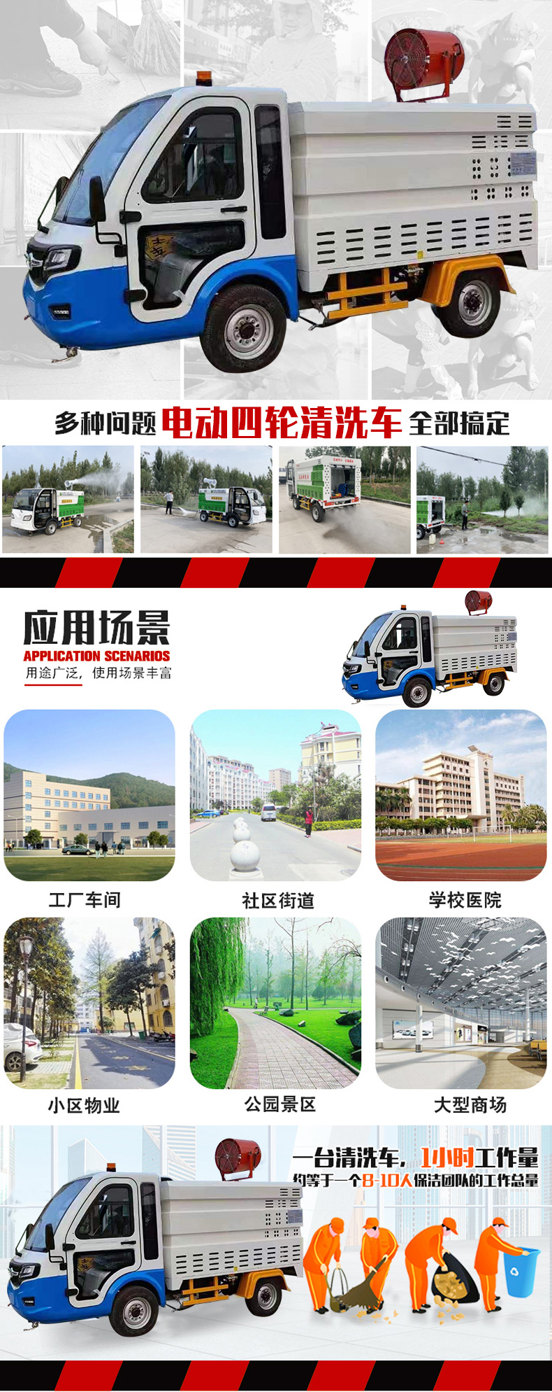 行道、小街巷道的沖掃,以及垃圾桶、果皮箱、公共設施的沖刷等;車輛體積小、易轉彎、噪