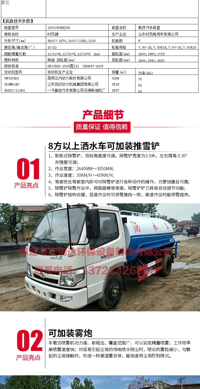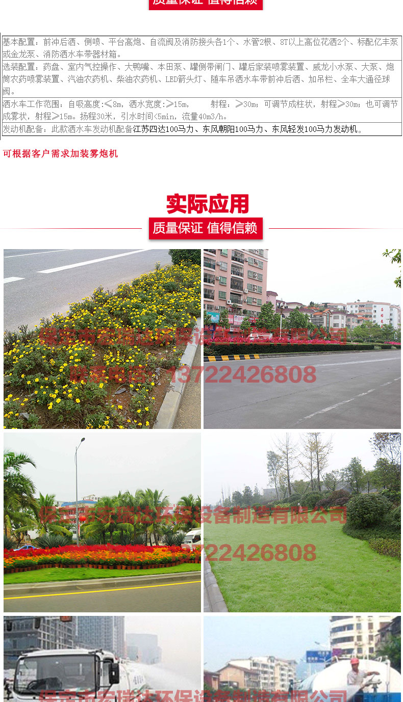 灑水車適合于各種路面沖洗,樹木、綠化帶、草坪綠化,道路、廠礦企業施工建設,高空建筑沖洗。具有灑水、壓塵、高、低位噴灑,農藥噴灑、護欄沖洗等功能,還具有運水、排水,應急消防。
