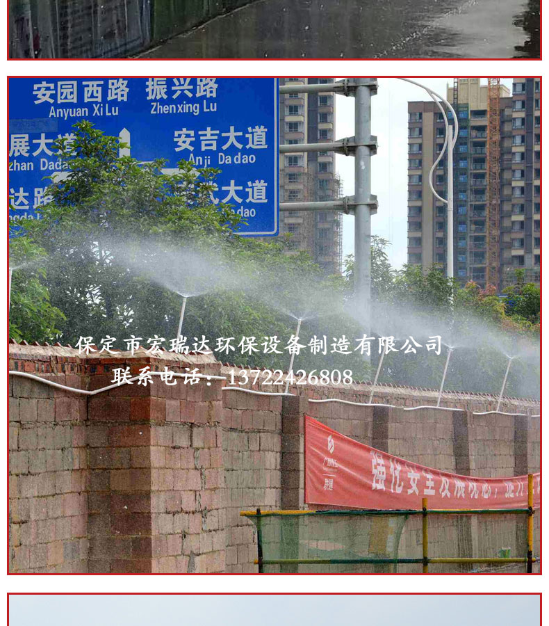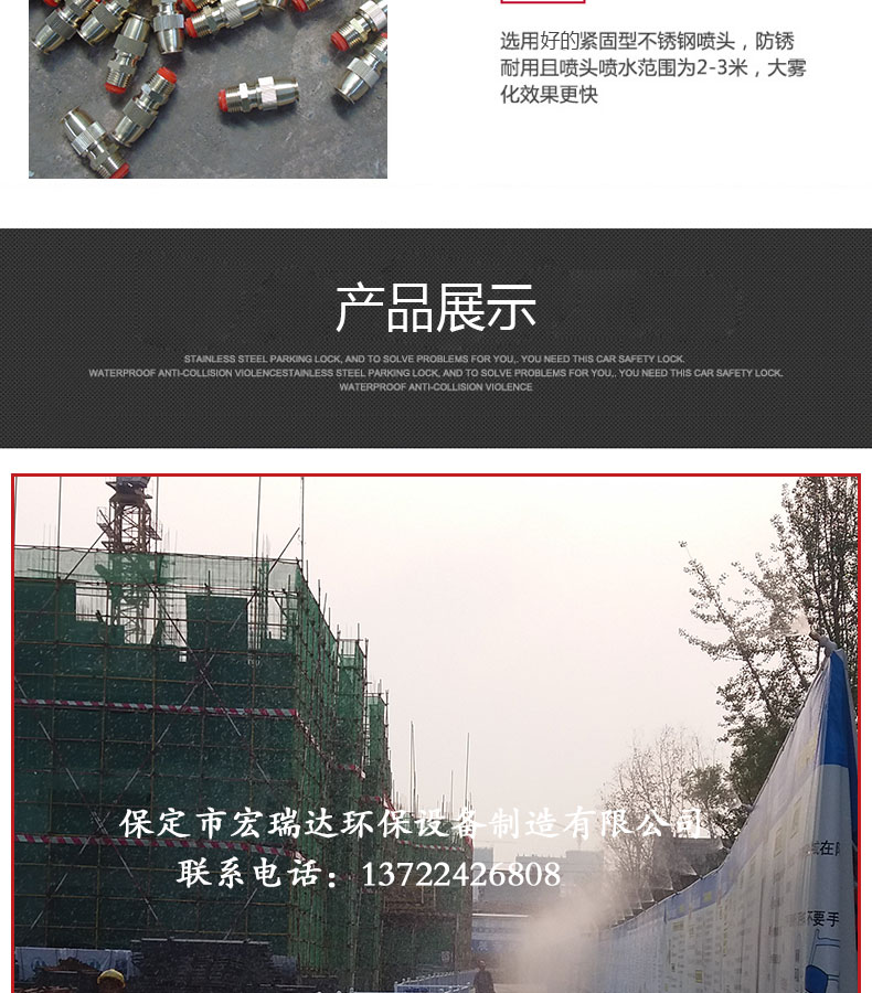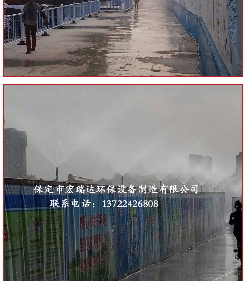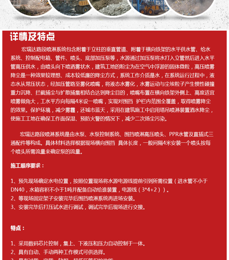 - 圍擋噴淋系統的構成是由PPR水管、直通、三通、彎頭等組成水流通的管路,水箱提供噴淋水源,多級泵給予輸送動力,電腦控制器控制整個系統。
